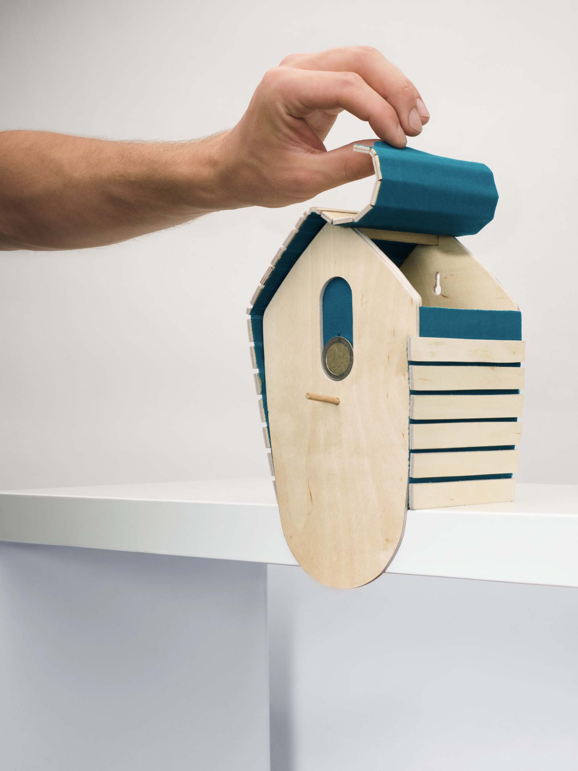 Pour ce lancement, les designers imaginent un objet pour votre entrée, une tirelire bois et feutre se posant sur vos console d’accueil. Telle une petite maison pour oiseau vous pourrez déposer à chaque passage votre monnaie et pièces restées au fond de vos poches afin de constituer une cagnotte pour vos plus gros projets.