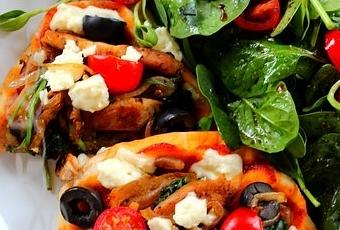 3)Sur un pain pita, ajouter la sauce tomate, l’origan et le mélange d’oignon, d’ail, de poulet et d’épinards. Parsemer de tomates cerises, d’olives et de fromage féta.