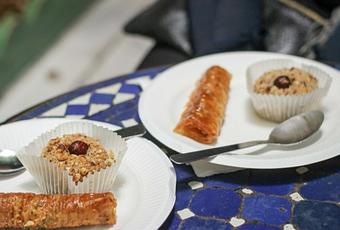 La plupart des gens pensent connaître le lieu, celui où on boit du thé, mange des gâteaux arabes, et va au hamam. Car en plus d’être un lieu magnifique (superbe végétation, de la mosaïque sur les tables, les murs.. des ornements partout..) la nourriture y est très bonne. C’est plutôt pour l’heure du goûter que l’on y va. Les pâtisseries là bas sont à tomber. Chaque pâtisserie coûte 2€, quand on en prend pas mal ça reviens à cher le gouter, mais à vrai dire elles sont tellement bourrative et pleine de goûts que 2 ou 3 suffiront pour vous sustenter à quatre heure !