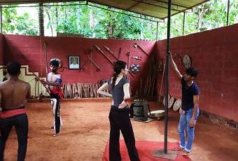 L’objectif de cet été était d’inviter trois artistes indiens de kalarippayatt à jouer dans Via. Trois semaines de création dans le kalary , lieu sacré, réservé au kalarippayatt, qui pour l’occasion s’est aussi transformé en salle de création et de répétition (avec les instruments de musique et le mât chinois).
