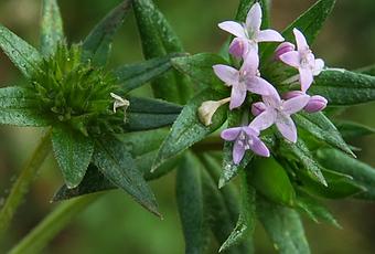 Sherardia arvensis (Shérardie des champs, Rubéole des Champs) : plante annuelle en touffe, à nombreuses tiges quadrangulaires, scabres aux angles ; feuilles lancéolées, mucronées, scabres, verticillées par 4-6 ; fleurs rose-lilas en têtes terminales entourées et dépassées par un involucre de folioles soudées à la base, corolle en entonnoir à 4 lobes étalés, 4 étamines ; fruits secs à 2 carpelles soudés et surmontés de 3 dents.