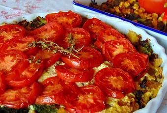 On mélange les légumes et l'appareil.On verse dans un moule à quiche.On couvre de tranches de tomates.On enfourne à 350 pendant 30-45 minutes.