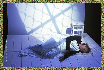 Tout est blanc, comme un écran sur lequel on pourra projeter des images, des visions ... alors que l'avenir est sombre. L'étroitesse de l'espace de jeu est adéquat pour renforcer l’oppression de l’enfermement. Le comédien tourne en rond, répétant en boucle l'annonce de sa condamnation à mort, jusqu'à l’obsession, en toute logique, car il y a de quoi devenir fou.