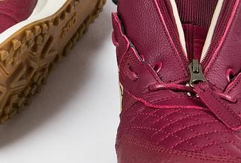 Les détails sur la paire incluent des coutures matelassées au niveau des orteils. On remarque également une petite ceinture sur le talon ainsi que des boutons sur la toe box. Ce cuir burgundy fait référence à la passion de Ghostface Killah pour les blousons en cuir.