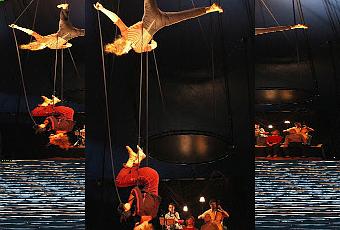 Le disque devient bateau dans une tempête, semblant lutter contre le déséquilibre. Les fils de tension résonnent, répercutent, crissent, crachent, composant un orchestre de percussions dans lequel le violoncelle est le premier à s'intégrer. Son compère s'invite sur la piste pour un air devenu oriental.Ce sont d'étranges ballets que les deux acrobates et les deux fildeféristes composent, en glissant d'un tableau à un autre, comme en une suite infinie de fondu-enchainés. La musique devient jazzy, et donc joyeuse. les acrobates lui répondent par des suspensions humoristiques en mimant le danger.