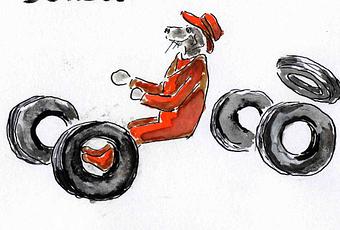Charles Goodyear http://fr.goodyear.ca/fr-CA/company/tire-history/1898-1916 avait découvert la vulcanisation du caoutchouc dès 1839. Bien que son procédé soit encore utilisé actuellement, il mourut dans la pauvreté. Le premier pneu pour voitures hippomobiles (brevet déposé par Robert William Thomson en1845) n’eut aucun succès. En 1888, un vétérinaire écossaisJohn Boyd Dunlop qui fabriquait lui-même ses gants en caoutchouc introuvables dans le commerce, entend son garçonnet d’une dizaine d’années se plaindre d’avoir mal aux reins en descendant de son tricycle aux roues équipées de bandages en caoutchouc plein. En palpant le ventre d’un cheval, il pense qu’un boyau gonflé d’air posé sur les roues, permettrait par son élasticité de soulager son fils. Sitôt dit, sitôt fait, il confectionne trois “chambres à air” qu’il gonfle et fixe sur les roues du tricycle. Il fait breveter son invention, s’associe à un industriel et crée sa propre société de pneumatiques. Bien qu’ayant fusionné en 1999 avec Goodyear, la marque existe toujours et a gardé et son lieu d’implantation, Birmingham, et sa spécificité. Vous avez peut être reconnu la patte de mon inspirateur : Savignac. Dunlop, un lien sur son histoire : https://www.dunlop.eu/dunlop_frfr//_header/about_us/history/