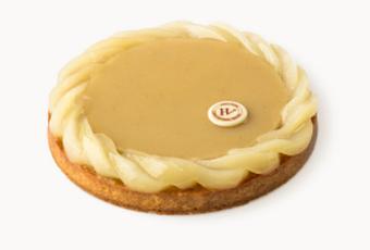 La maison Hugo et Victor présente la tarte Pyrus. La tarte Pyrus est composée d’une pâte sucrée, de crème d’amande, d’une compotée de pommes au « Cœur du Breuil », d’une gelée de poire et poire pochée.