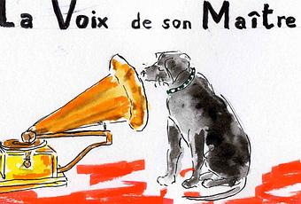 Nipper était un petit fox dont le maître était mort. Était-ce le frère ou un ami du peintre Francis Barraud, les avis différent. Toujours est-il que le chien semblait écouter avec intérêt le phonographe de son ancien maître et que le peintre eut l’idée de réaliser un tableau le représentant. Puis il délaissa son œuvre et quand il la reprit, pour l’actualiser, il emprunta un gramophone à la société Gramophone Company. Il montra son tableau terminé au directeur, William Barry Owen qui lui acheta immédiatement pour 100 livres, droits de reproduction compris. C’est ainsi que Nipper remplaça la précédente marque de fabrique, un angelot gravant un disque avec une plume. http://www.lesartsdecoratifs.fr/francais/musees/musee-des-arts-decoratifs/collections/dossiers-thematiques/marques-et-personnages/pathe-marconi . Et, très intéressant malgré une traduction un peu curieuse parfois : https://m.thevintagenews.com/2017/04/28/his-masters-voice-the-origins-of-the-famous-jack-russell-terrier-nipper-the-canine-advertising-icon-for-many-gramophone-companies/ La Gramophone Company, après bien des péripéties de vente, d’achat ou de fusion deviendra la “Electrical and Musical Industries” (EMI). La société française, Pathé Frères s’associera en 1922 avec EMI et deviendra jusqu’en 1990 Pathé - Marconi “La voix de son Maître”. Le tableau original de Francis Barraud serait actuellement au siège de la société EMI, à Hayes dans le Middlesex. Des nouvelles fraîches de Nipper : http://www.getwestlondon.co.uk/news/west-london-news/gigantic-hmv-nipper-dog-statue-13677842