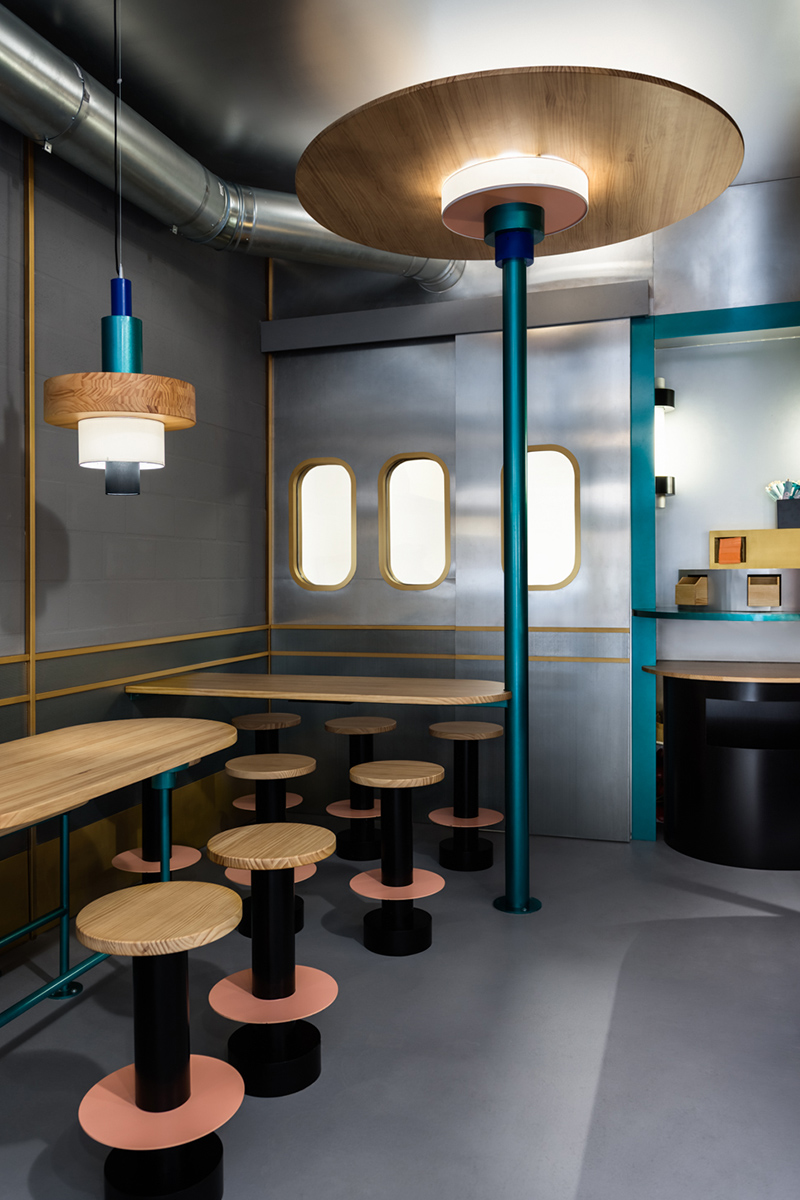 De cette façon, un ensemble d’éléments métalliques, de briques et de béton démontrent un aspect urbain et moderne, tandis qu’une touche boisée, de chaleur, est ajoutée au design. Les couleurs utilisées fusionnent avec une apparence drôle, y ajoutant une joie ironique.