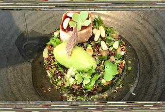 Les belles assiettes métisses embarquent, surprennent, flattent. Le chef renouvelle la partition classique du taboulé et lui apporte un peu de texture avec cette tuile réalisée à partir d'une peau de tomates ; s'amuse à jouer avec les goûts et joue les entremetteurs entre le mulet et la granny smith : coloré, frais, détonnant.