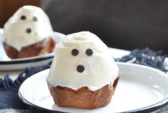 - Laissez refroidir les muffins, démoulez-les et recouvrez-les de glaçage frais en essayant de recréer la forme d'un fantôme. Rajoutez 3 pépites de chocolat sur chaque glaçage pour faire les yeux et la bouche du fantôme.