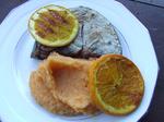 Pour la purée, c'est moitié pommes de terre/moitié patate douce. Un peu de beurre, et le jus de la moitié d'orange qui me restait sur les bras.
