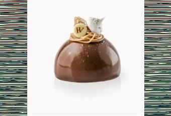 La création pâtissière est composée d’une dacquoise noisette, une meringue, une bavaroise marron et un crémeux marron aux brisures de marrons. Le décor est fait de vermicelles marron et brisures de marrons glacés