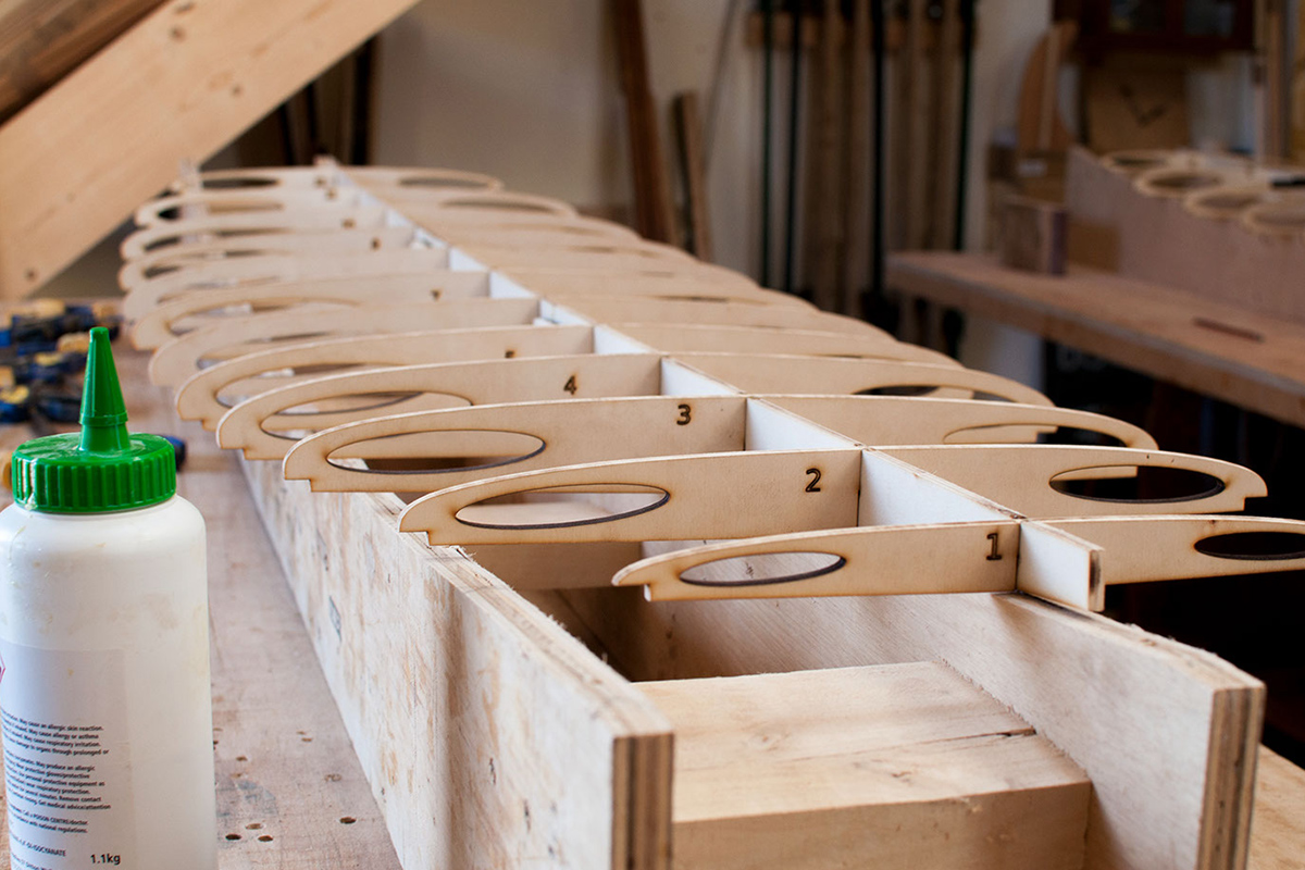Tout d’abord, le premier jour, le cadre intérieur de la planche a été conçu. Il a ensuite été collé à la « peau de cèdre » du fond. Le deuxième et le troisième jour ont étaient dédiés à la réalisation et l’assemblage de rails construits à partir d’une série de bandes. Ensuite, les rails ont été façonnés et poncés à la planche. Les deux « peaux » et les rails sont entièrement fabriqués à partir de cèdre rouge de l’Ouest.