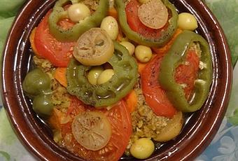 2. En un tagine, verter el aceite de oliva, añadir la cebolla picada y cocinar durante aproximadamente 4-5 minutos. Añadir las albóndigas de sardina y sobre ellas colocar las zanahorias, tomates, pimientos, el limón, todos cortados en rodajas, y las aceitunas. Espolvorea con un poco de pimienta.