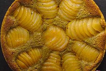 - Découper les demies poires en tranches fines de 4 mm environ. Placez les sur la crème de pistache en les soulevant avec la lame d'un couteau large ou une spatule: enfoncer légèrement les poires dans la crème.