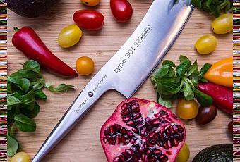 S'il doit n'y en avoir qu'un, quelle forme de couteau choisir ? Ceux qui nous suivent ont la réponse à la question, pour nous le plus essentiel est celui avec lequel on fait le plus de choses et là, pas photo : c'est le Santoku ou "chef japonais". Le chef français est avant tout un couteau pour couper loin. Il génère plus d'ondes de vibration que le Santoku pour couper près. Une des meilleurs ventes de Chroma est d'ailleurs sa nouveauté 2017, ce Santoku spécial de la région de Fukuoka, le Hakata. Son "retombé" allonge le potentiel de coupe d'un bon centimètre et sa courbure est extraordinaire pour les brunoises et mirepoix. Existe en uni et en martelé.