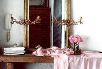 Miroir doré & jeté de satin rose pour cette entrée très girly