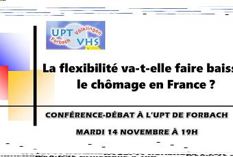 C’est pourquoi, afin d’analyser les tenants et aboutissants de la flexisécurité érigée comme principe de la future loi travail, je propose une conférence grand public, qui se tiendra à l’Université Populaire Transfrontalière (UPT) de Forbach (durée 1h30), le mardi 14 novembre à 19h, et aura pour titre La flexibilité va-t-elle permettre de faire baisser le chômage en France ?