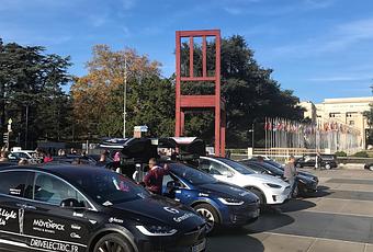 Accompagnés de ces nouveaux amis, nous partons en convoi en direction du Palais de l’ONU à Genève, dont nous investissons la place avec au total plus de 100 véhicules électriques. Automobiles, mais aussi scooters et mêmes vélos! L’explorateur Bertrand Piccard (dont l’interview est à voir ici), le président des Nations Unies à Genève Michael Møller et Luc Barthassat, responsable du département de l’Environnement, des Transports et de l’Agriculture du Canton de Genève, sont présents sur place, tous trois prônant le passage à la mobilité verte lors de discours prononcés devant la torche Light Us que nous portons à la COP23.