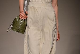 Les volumes sont amples, comme des parachutes imaginaires. La soie et l'organza se gonflent sur les manches et la silhouette puis sont serrés par des coulisses, des liens, des ceintures. Les dessins abstraits de carlingues d'avions, mémoire et emblème de voyages lointains, deviennent des motifs décoratifs : des panneaux en cuir découpé et appliqué définissent les robes, les vêtements d'extérieur, les blouses et les pantalons.