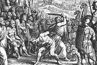 "Je regrette d'avoir établi Saül pour roi, car il se détourne de moi et n'accomplit pas mes paroles." Samuel fut irrité et il cria à l'Eternel toute la nuit.On voit que Mahomet ne fit qu'imiter ces sympathiques "prophètes", pas psychotiques du tout, non, puisqu'on vous le dit... Le lendemain de cette nuit paisible, remplie d'un dialogue intime et tout de douceur avec ce Dieu d'amour et de joie, Samuel s'approcha du roi des Amalékites. Celui-ci "se montra joyeux", pensant que Samuel s'était calmé (ça ne vous rappelle rien ?). Mais "Samuel le met en pièces" (ibid., 15, 31, voir la gravure ci-dessus). Parfait pour éduquer les enfants. Dans l'amour et la joie.