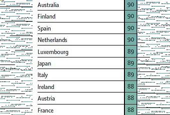 Andorre (pays européen d’un peu plus de 85.000 habitants) atteint un score de 95, suivi de l’Islande (94) et de la Suisse (92). Les pays scandinaves dans le top 10, la France, en 15e position avec un score à 88. L’Australie 6e (90) et le Japon 11e (89). Le Royaume-Uni arrive au 30e (85), et les États-Unis au 35e rang (81).