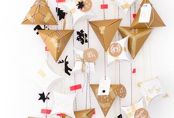 Assembler les 24 boites. Ajouter les chocolats à l'intérieur. Les refermer avec le ruban washi tape doré. Décorer chaque boite avec une étiquette, une figurine en feutrine, des dessins, des petits mots selon les envies. Attacher chaque boite avec de la ficelle et les accrocher à différentes hauteur de façon harmonieuse sur le cintre. Découper et coller quelques morceaux de washi tape rouge ici et là.