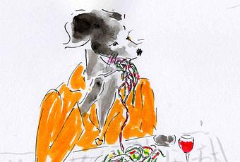 Peut-être pas comme ici, sous forme de spaghettis verts, blancs, rouges, mais j’aime bien la marque Barilla. Dans un grand saladier, vous mélangez des dés de tomate crue, de mozzarelle (la feta est moins couleur locale, mais le goût est plus prononcé...), du basilic frais si possible, de la bonne huile d’olive. Vous salez et poivrez bien. Vous laissez macérer un petit quart d’heure. Et vous versez votre préparation sur un plat de “Penne” cuit al dente et bien égoutté. Vous remuez bien. Surtout, à table tout de suite ! c’est bon froid aussi d’ailleurs mais tiède c’est un délice.