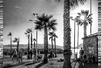 Enfin, sans aucun doute plus désespéré au sortir que je ne l'étais à l'entrée, à la prière insistante de l'intéressée, j'ai (é)garé la voiture sur un parking à peine éloigné, afin de gagner sans tarder ce qui est assurément un véritable salon du bien-être permanent. Ici et là des enfants jouaient à éviter les vagues de cette mer encore trop ensoleillée pour trouver la force d'effacer nos pas sur le sable. Au coin, sous les palmiers travestis en lampadaires tant le soleil semblait s'y accrocher, un saxophoniste se prenait pour un oiseau, disputant aux mouettes le chorus de la bande son de ce long après-midi d'automne.