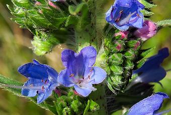 Echium vulgare (Vipérine) : tige robuste dressée hérissée de poils raides ; feuilles lancéolées hérissées de poils raides ; fleurs rassemblées en grappes nombreuses s'échelonnant le long de la tige, corolle à symétrie bilatérale rougeâtre devenant bleue, étamines saillantes.