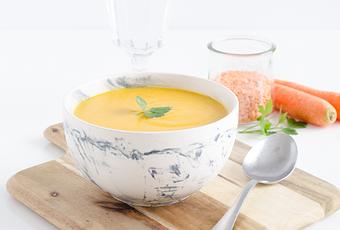 Soupe de carottes et lentilles corail au lait de cocoPour 4 personnes Préparation: 15 minutes Cuisson: 30 minutesIngrédients