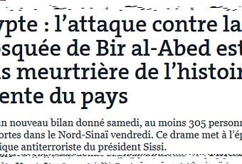 Encerclant le complexe religieux avec quatre véhicules tout-terrain, une quarantaine d’hommes armés, masqués et vêtus d’uniformes militaires, ont ouvert le feu dans la salle de prière et sur les fidèles qui tentaient de fuir, allant jusqu’à brûler les véhicules pour bloquer les routes, selon des témoins. Au moins 305 personnes ont été tuées, dont 27 enfants, et 128 autres blessées par les assaillants qui ont pu prendre la fuite avant l’arrivée de l’armée, selon les dernières déclarations du parquet égyptien, samedi 25 novembre. (source)