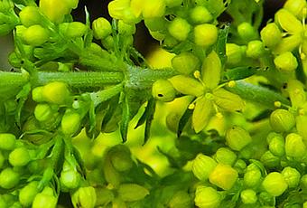 Galium verum (Gaillet jaune, Caille-lait jaune) : herbacée à tiges dressées, parfois velues ; feuilles verticillées par 6-12, très étroites; fleurs odorantes en long panicule pyramidal dressé, corolle à 4 lobes étalés jaunes ; fruit en capsule ovoïde lisse.