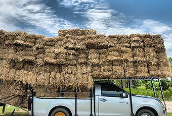 Il ne possède aucun équipement. Il doit donc faire appel à une moissonneuse qui lui prend 6000 bahts pour l'ensemble de sa terre. Et au camion du cousin qui prend 1200 bahts car les champs sont loin de la ferme. Ne t'inquiète pas, je traduirai en euros plus tard si tu es noyé.