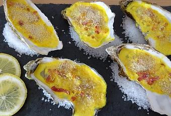 Huîtres chaudes au mascarpone, curcuma et lardons