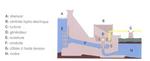 Une ouverture (E) au bas du barrage (A) permet à l'eau de s'engouffrer avec vitesse à l'intérieur d'une conduite (F).