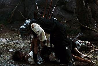 Voir Miike s’attaquer à nouveau au chanbara, c’était au moins l’assurance d’assister à nombre de combats sanglants, ces affrontements grandiloquents que le cinéaste japonais affectionne tout particulièrement. De ce point de vue, difficile de se montrer déçu, tant Miike franchit un cap supplémentaire dans le gore et l’outrancier (et ce dès l’introduction donnant immédiatement le ton), même après ses Audition et autres Ichi the Killer déjà bien chargés en hémoglobine. Une violence oscillant entre un premier degré inconfortable (le meurtre de la famille de – notamment), et un second presque cartoonesque, Miike ne faisant pas l’économie d’un sens de l’absurde et du ridicule aux antipodes des canons du genre. Blade of the Immortal ressemblerait en cela à un lointain cousin un brin dégénéré de 13 Assassins, davantage qu’à un héritier de The Assassin et de son approche contemplative.