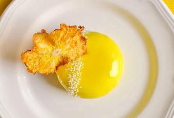 Préparez l'insert ananas. Faites ramollir la gélatine dans un bol d'eau froide. Mixez l'ananas avec le sucre et versez ce coulis dans une casserole. Chauffez la préparation et incorporez la gélatine. Versez dans un moule recouvert de film alimentaire et réservez au congélateur.