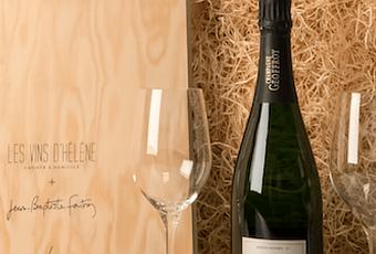 Ce coffret exclusif dessiné par le designer Jean-Baptiste Fastrez (Galerie Kréo) sert d'écrin à la cuvée spécialement créée par la Maison Geoffroy pour les Vins d'Hélène.