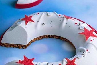 La Bûche Candy : constituée de biscuit aux amandes, de confit de fruits rouges, de crémeux aux amandes et de mousse lactée à la vanille. La buche est nappée et décorée avec des framboises fraîches, de quenelles de chantilly et d’étoiles en chocolat blanc et de guimauves.