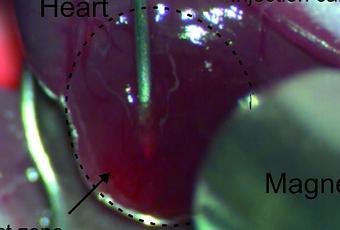 Un champ magnétique permet à ces cellules chargées de nanoparticules de rester en place sur le site de la réparation. Il s'agit tout simplement d'un aimant placé à quelques millimètres de la surface du cœur et qui permet à 60% des cellules injectées de rester en place, vs 25% environ en cas de " greffe standard ". 10 minutes sous ce champ magnétique suffisent à conserver une proportion significative de cellules musculaires chargées en nanoparticules sur le site cible. Et des jours après la procédure, les cellules injectées sont toujours en place, se sont progressivement intégrées au tissu existant et commencent à se multiplier.
