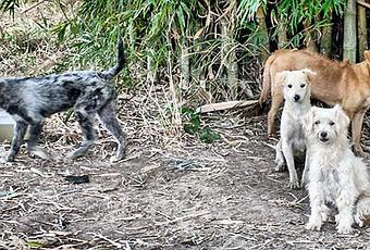 Chaque fois que nous empruntons la route de terre bien cabossée qui mène au lac, nous voyons cinq chiots qui vivent leur vie au milieu des champs de cannes, loin de toute habitation. Ce sont des animaux de bel aspect, d'allure sympathique. On ne voit pas leurs côtes. Ce qui est amusant, c'est qu'on dirait qu'ils ont eu cinq pères différents : sons of a bitch !