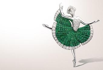 Est-ce Anna Pavlova, Pierina Legnani ou encore Marie Taglioni également peinte par Degas ? Le visage en or jaune ou stylisé par un diamant taille rose s'incline légèrement. Le bras s'élève avec élégance, la jambe est tendue et le pied, cambré. Une ballerine-fée s'élance dans les airs avec sa baguette magique tandis qu'une autre réalise une arabesque. Tels de petits rats d'opéra, deux fi llettes tiennent la pose. Les poudriers rendent hommage à de grands ballets classiques : Raymonda et Le Lac des Cygnes. Sous les feux de la rampe, la princesse Odette en diamants évolue parmi les danseuses, sous un ciel étincelant d'étoiles. Sur certains clips, la richesse des associations de pierres précieuses restitue celle des costumes de scène, leur volume, leur texture. Le tutu classique en diamants taille rose de la Danseuse espagnole (1941) est doublé d'émeraudes. Ceux des ballerines françaises se déclinent en sequins concaves d'or jaune ponctués au centre de cabochons de turquoise ou de rubis. L'or est ondulé, plissé et surtout repercé pour fi gurer une résille, de la broderie anglaise ou un tulle délicat porté par la ballerine de 1993, la plus récente de l'exposition. Le moindre détail est restitué : la ceinture de diamants, les manches volantées en saphirs, l'éventail ourlé de rubis. .