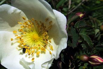 Rosa pimpinellifolia (Rosier pimprenelle) : tiges dressées densément pourvues d'aiguillons droits, fins et inégaux ; feuilles à 5-9 folioles ovales ; fleurs solitaires, blanches, sépales lancéolés persistants ; cynorhodons arrondis rouges devenant noirâtres.