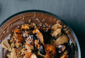 - 3. Avant de servir, préparer le crumble. Concasser les spéculoos en miettes, puis en saupoudrer les pots de crème au chocolat. Faire chauffer une poêle. Concasser les amandes, puis les faire rôtir 2 minutes à la poêle.