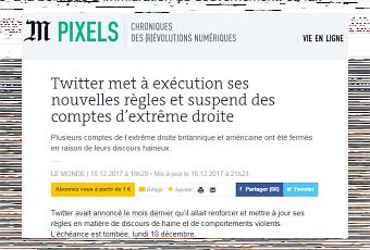 N'importe quel utilisateur du réseau (a)social qu'est devenu twitter pourra vous le confirmer : impossible de s'y promener tranquillement sans être confronté un jour ou l'autre (moi, c'est plus souvent, forcément : je les traque) à des contenus racistes, xénophobes, homo ou transphobes, sexistes ou grossophobes. Les menaces, y compris de mort, n'y sont pas rares. Le harcèlement en ligne y est fréquent. L'apologie de la violence, du terrorisme, ne provenant pas seulement de là où on est enclin à l'attendre, sont monnaie courante, tristement banalisés. La majorité de ses publications insupportables ne vient pas à ce que je vois de l'extrême gauche (hormis de très rares exceptions qui emportent ma colère), mais de l'extrême droite. Aussi, comme je suis ravi de la décision de Twitter de traquer les contenus de ce genre et de suspendre les comptes qui s'en rendent un peu trop volontiers responsables !