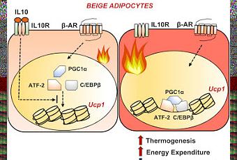 Les voies de signalisation qui stimulent la thermogénèse du tissu adipeux sont bien caractérisées ; toutefois, les facteurs limitant la dépense énergétique restent largement inconnus. Ici, nous montrons que l’élimination de la cytokine IL-10 anti-inflammatoire améliore la sensibilité à l’insuline, protège contre l’obésité induite par l’alimentation et déclenche le brunissement du tissu adipeux blanc. Des études mécanistiques définissent la moëlle osseuse comme la source de la signalisation IL-10 et les adipocytes comme la type de cellules cibles relayant ces effets. Les adipocytes matures sont très riches en récepteurs IL-10 à sous-unités alpha, qui sont stimulés en réponse à la différenciation, l’obésité et au vieillissement. Une technique de séquençage de la chromatine accessible par les transposases (ATAC-seq), ChlP-seq, et RNA-seq révèlent que IL-10 réprime la transcription des gènes thermogéniques dans les adipocytes en altérant l’accessibilité à la chromatine et en inhibant le recrutement de ATF et C/EBPβ auprès des régions enhancer. Ces résultats amplifient notre compréhension de la relation existante entre les voies de signalisation de l’inflammation et la fonction du tissu adipeux ; et fournissent un éclairage dans le contrôle physiologique de la thermogénèse et indiquent la voie vers de nouveaux traitements. Prashant Rajbhandari, et al, dans Cell, publication en ligne en avant-première, 14 décembre 2017