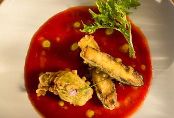 Les beignets de fleurs de courgettes farcies à la mozza assaisonnées à froid d’huile d’olive