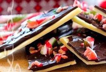 4)Dans un bol, au bain-marie ou au four à micro-ondes, fondre le chocolat noir haché. Ajouter le reste du chocolat noir en morceaux et remuer jusqu’à ce que le chocolat soit tempéré. À l’aide d’une spatule coudée, répartir sur le carré de chocolat blanc cristallisé. Saupoudrer de cannes de bonbon émiettées. Laisser cristalliser au réfrigérateur 15 minutes.